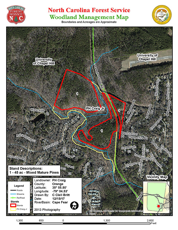 In a 2015 story, Mr Craig commented in the News and Observer “that people enjoy walking (my) his land along the creek, despite past damage from mountain bikes …While (I) he has never cut the trees, there may be a thinning in the future to reduce the fire hazard and make the forest healthier.”