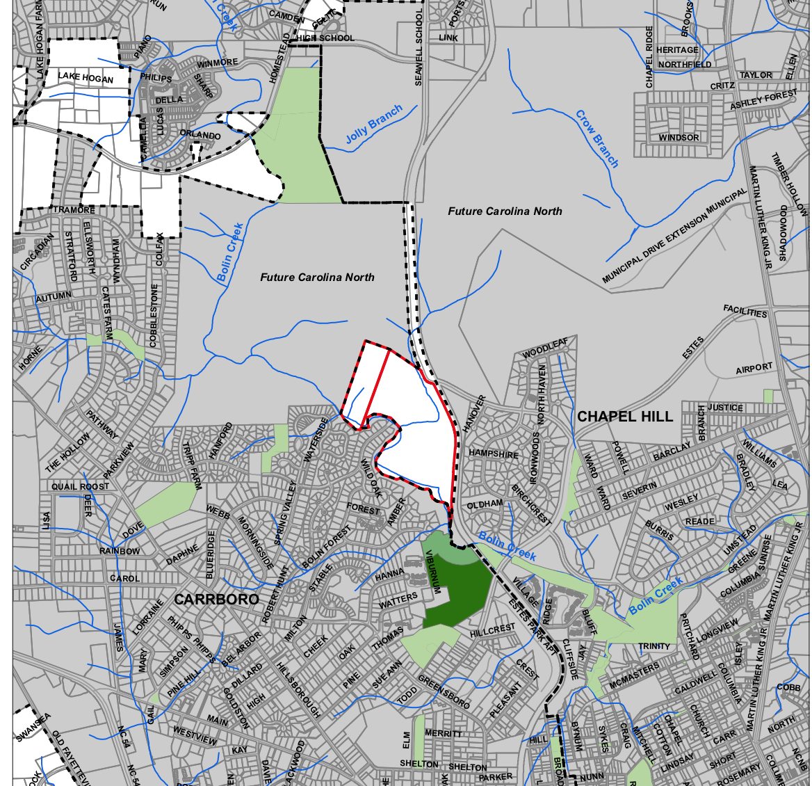 The P.H. Craig land is located next to the Ironwoods neighborhood, just south of Carolina North, and north of the Adams Preserve as illustrated here.