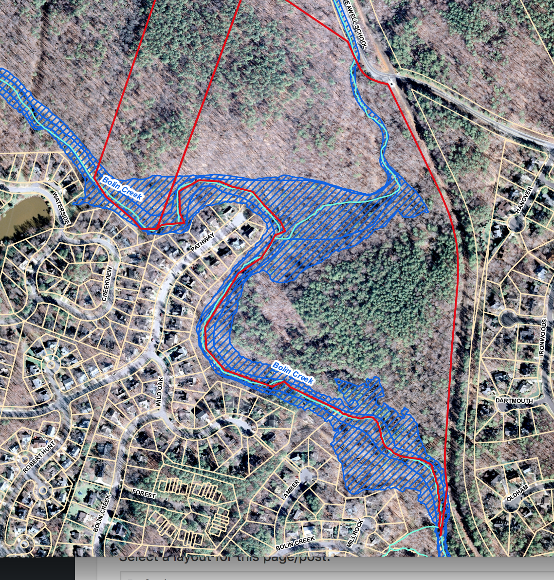 But PH Craig has announced his intention to clearcut up to 40 acres of trees on his property. (See area map below.) The “woodland management plan” targets pines but all trees in the upland portions will be removed down to a line of trees marked with pink ribbons just 150 feet from Bolin Creek, up to 35 acres in Carrboro’s planning jurisdiction. See management map at the end of this article.