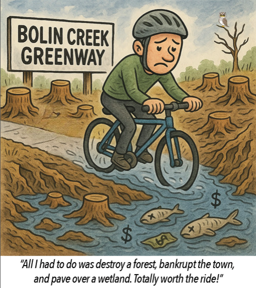 In its new 2025-26 budget proposal, the Town of Carrboro proposes to allocate $1.4 million in taxpayer funds for the design of a controversial greenway through Bolin Creek’s fragile riparian area. The council is expected to approve the final budget on June 3rd.