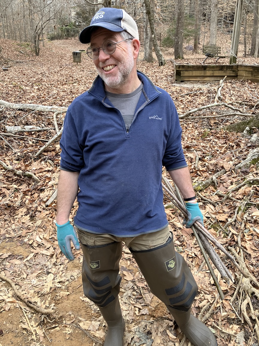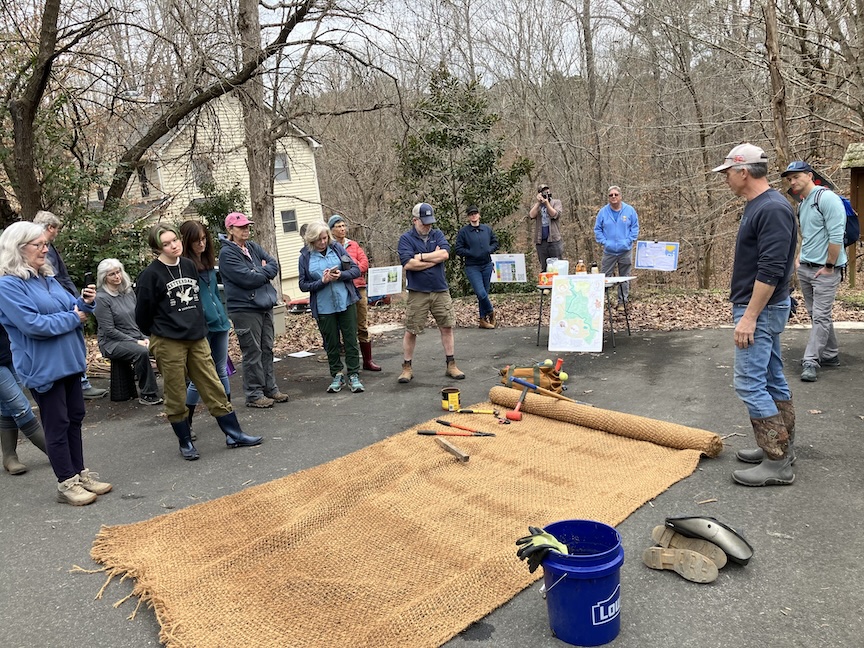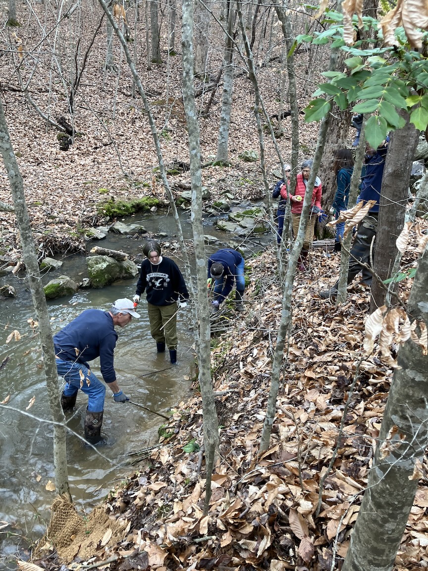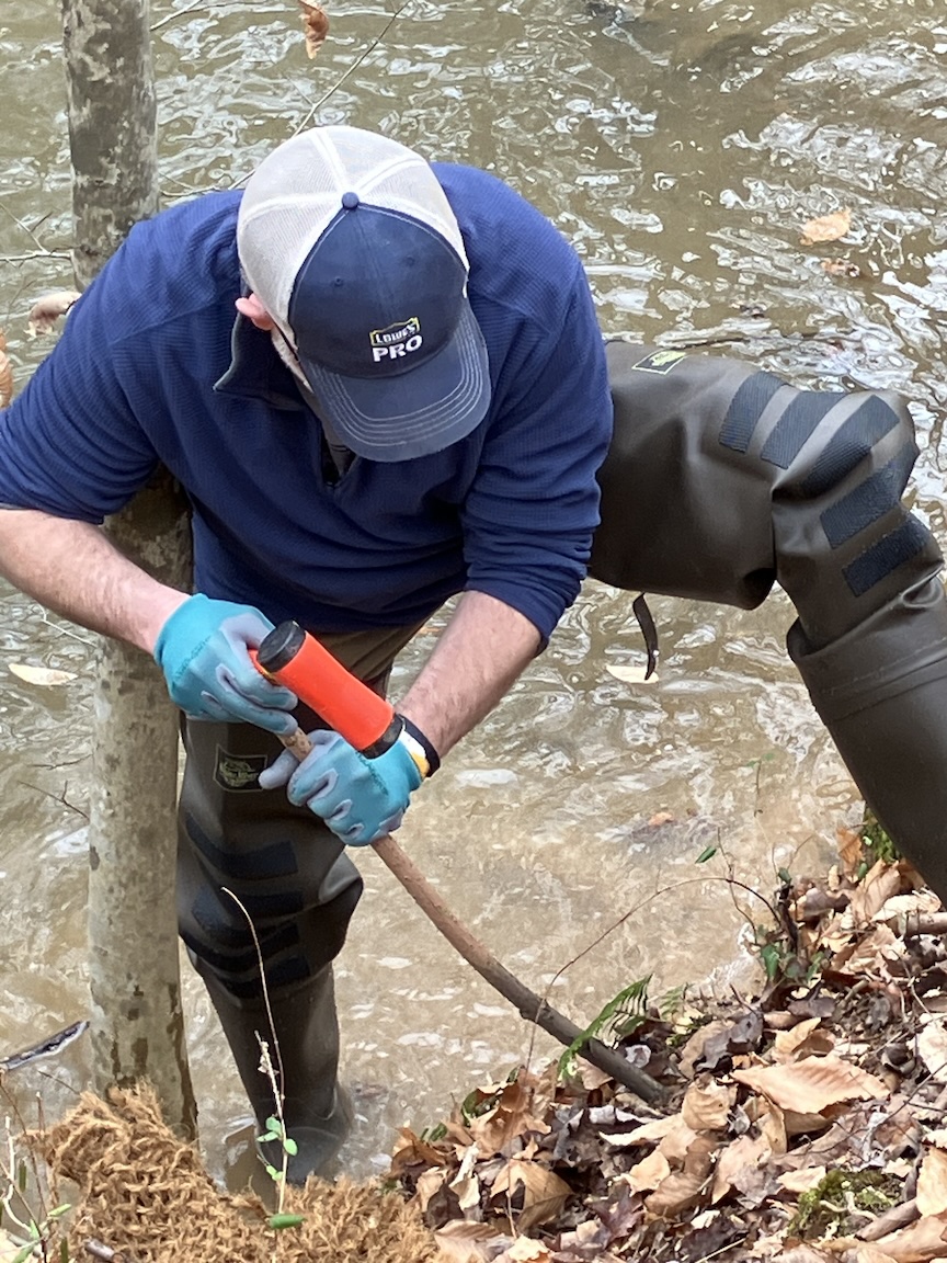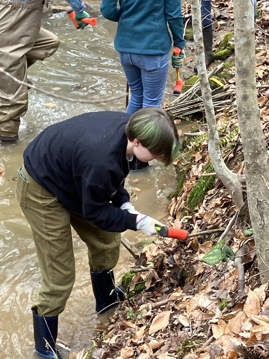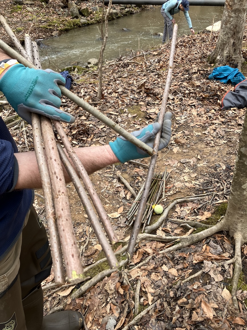 On Saturday, February 1, 2025, a group of over 35 volunteers turned out for the “Live Stake Workshop.” Some wore waiders to stand in the creek while installing live stakes into the creek bank. If the planting is successful, each stake grows into a small tree with a root ball that holds the bank together to prevent erosion.