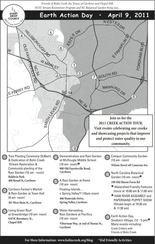 Friends of Bolin Creek announces the 2011 Creek Action Tour on Earth Action Day, April 9th. Visit simultaneous events from 10 – 12 noon showcasing projects that improve and protect water quality in our community and celebrate our creeks. Complete information can be found on our main page.
